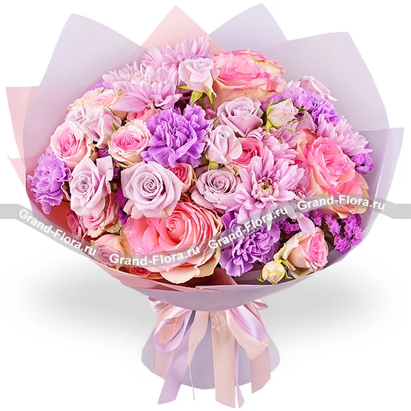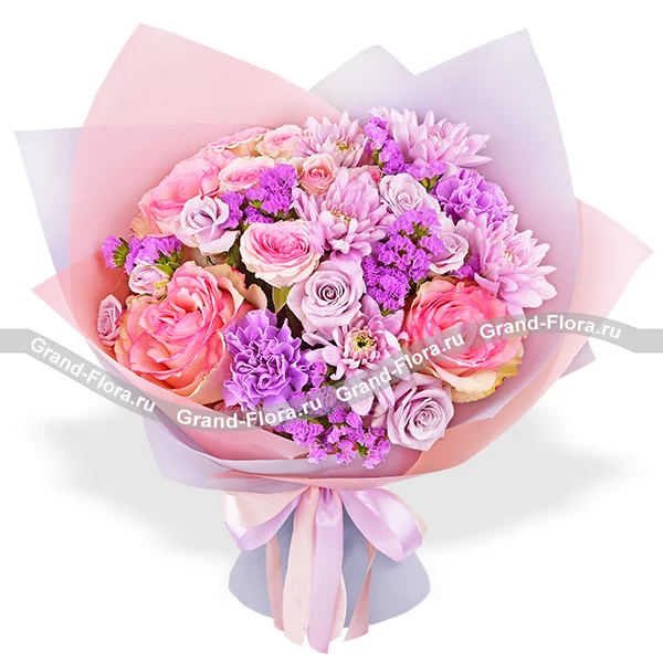 Букет выполнен из роз нежно – розовых и фиолетовых оттенков,  кустовой хризантемы сиреневого оттенка и гвоздики в тон композиции,  финальные аккорды статицы, в окружении невесомого розово – фиолетового фетра и ленты, завершают букет, делая его изысканным и элегантным.  Букет составляет от 30см в высоту, а диаметр от 20см до 35см, в зависимости от выбранного Вами варианта. Обращаем Ваше внимание, что состав и оформление букета могут отличаться.