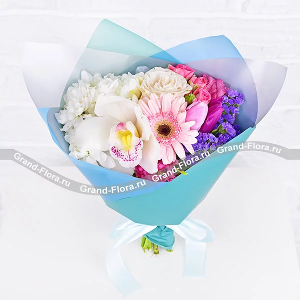 Стандартный: орхидея белая - 1 шт., гербера розовая - 1 шт., роза белая - 2 шт., хризантема кустовая белая - 2 шт., эустома розовая - 2 шт., роза кустовая розовая - 2 шт., тюльпан розовый - 1 шт., тюльпан фиолетовый - 2 шт., статица, упаковка, лента.Примерный размер: 30Х30 см.