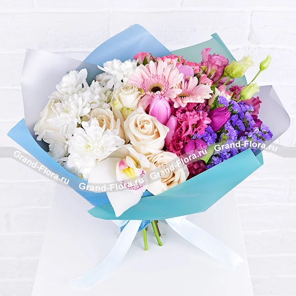 Люкс: орхидея белая - 1 шт., гербера розовая - 2 шт., роза белая - 5 шт., хризантема кустовая белая - 3 шт., эустома розовая - 3 шт., роза кустовая розовая -3 шт., тюльпан розовый - 4 шт., тюльпан фиолетовый - 4 шт., статица, упаковка, лента.Примерный размер: 40Х40 см.