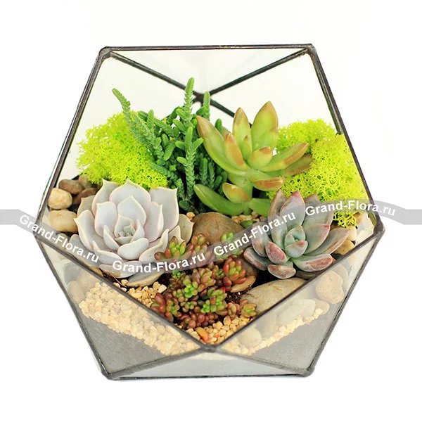 "Икосаэдр мини" - это небольшой флорариум с яркими суккулентами в вазе ручной работы. Очень гармоничная композиция, которая потребует минимального ухода. А весной, в период цветения суккулентов, от него просто невозможно оторвать взгляд!